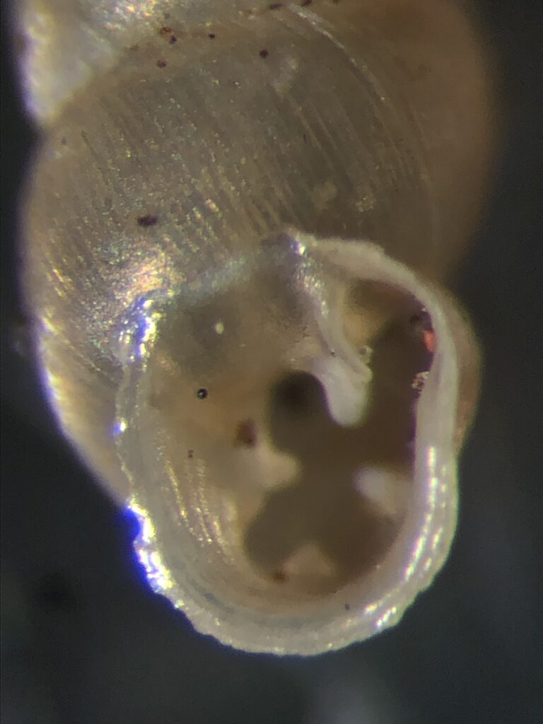 This animal is relatively small compared to its close relatives (less than 2.25 mm tall) and lacks a calcified thickening on the outside (palatal) wall of the aperture. Its shell color is a pale yellow-brown.