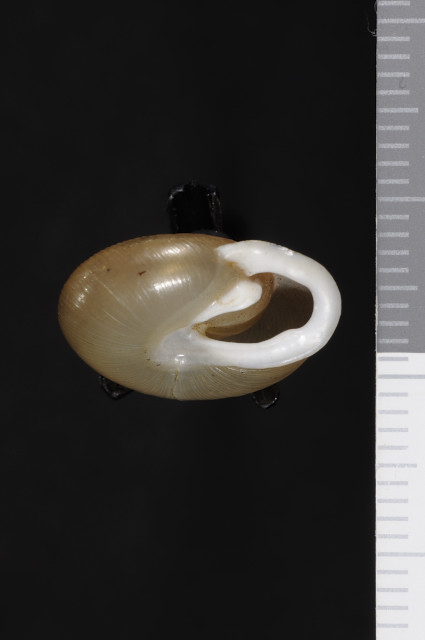 The glossy shell of Patera laevior is less angular at the periphery than P. appressa, and bears weaker microsculpture. As in P. appressa, the aperture is wide and rounded, with a broad lip and a sharp rim inside the basal part of the opening.
