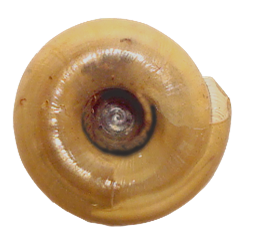 Photo(s): Shell of Ventridens lasmodon by Dan Dourson ©. Note the laminae seen through the base of the thin shell.
